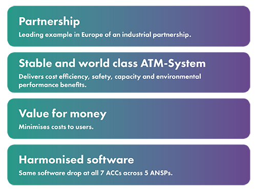 The COOPANS Alliance stands as the leading example in Europe of an industrial partnership with cooperation between multiple ANSPs and a good working relationship with its ATM system supplier. The COOPANS Alliance has now implemented the same software version at all 7 ACCs, across 5 ANSPs, within a very short timescale. Furthermore 4 out of 5 partners are now running CPDLC and all use the advanced ATM functionalities like 4D trajectories, MTCD and Mode S with downlinked parameters. Additionally all have the same integration platform and undertake common planning of validation.